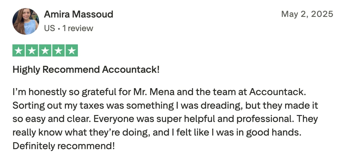 Accountack CPA, led by Mena Hemaia (CPA, CIA), is a digital-first financial firm with specialized agents across industries. We combine top-tier expertise with cultural understanding, making us the trusted partner for Arab entrepreneurs and professionals who want to grow wealth while paying less in taxes.